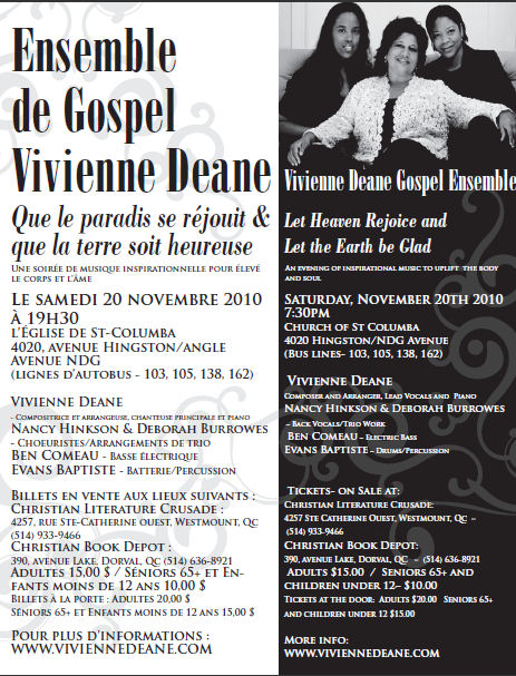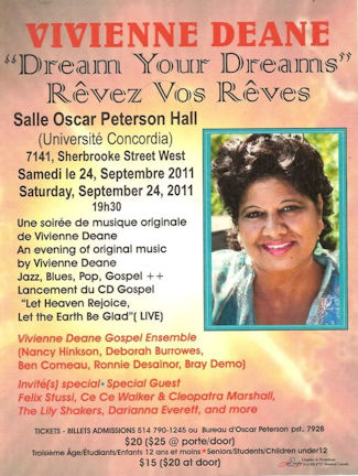 The Vivienne Deane Gospel Ensemble, along with special guests, performed at the Oscar Peterson Concert Hall (Concordia University - Loyola Campus) on Saturday, September 24 at 19:30. See the poster below for more information.